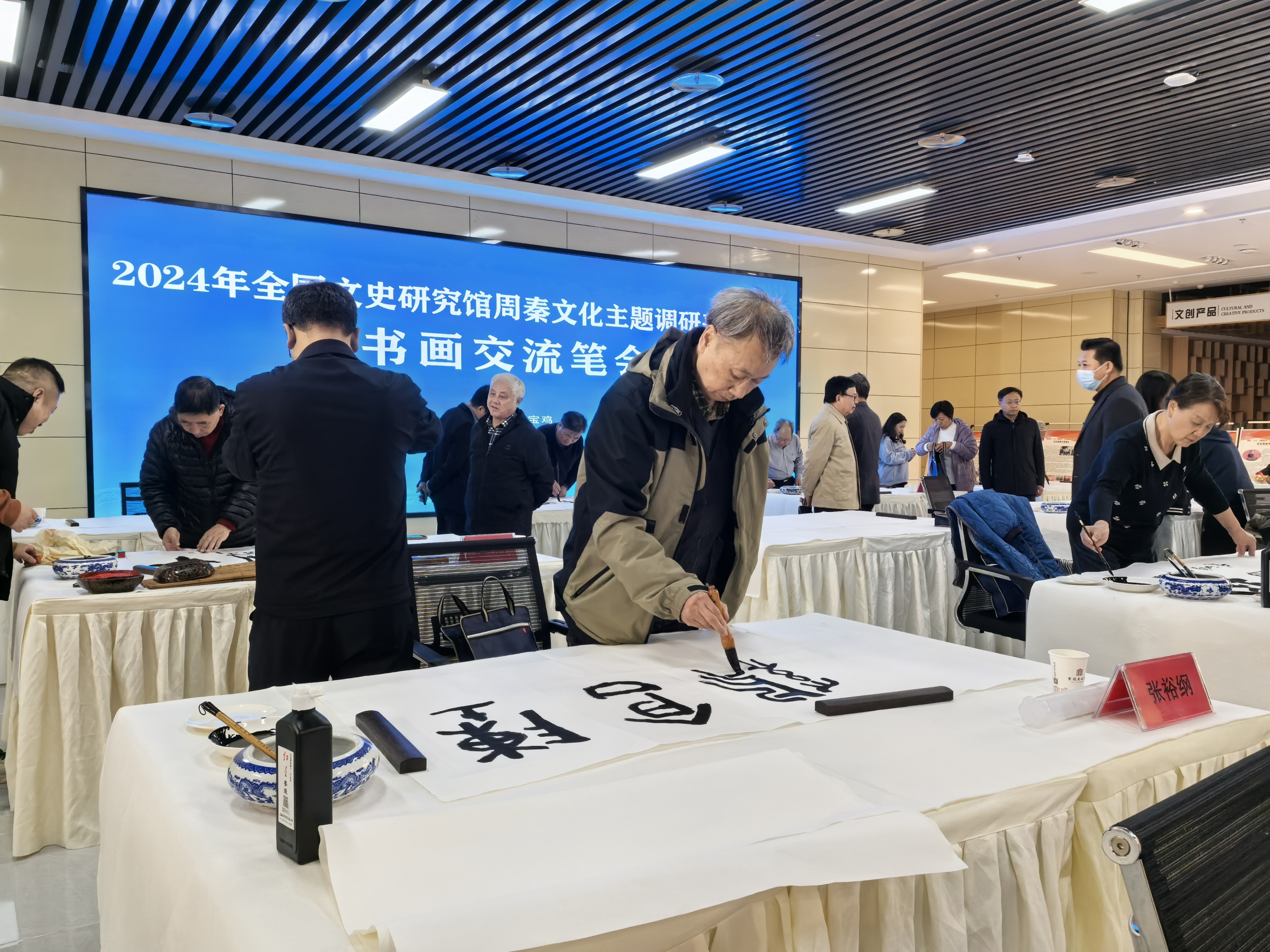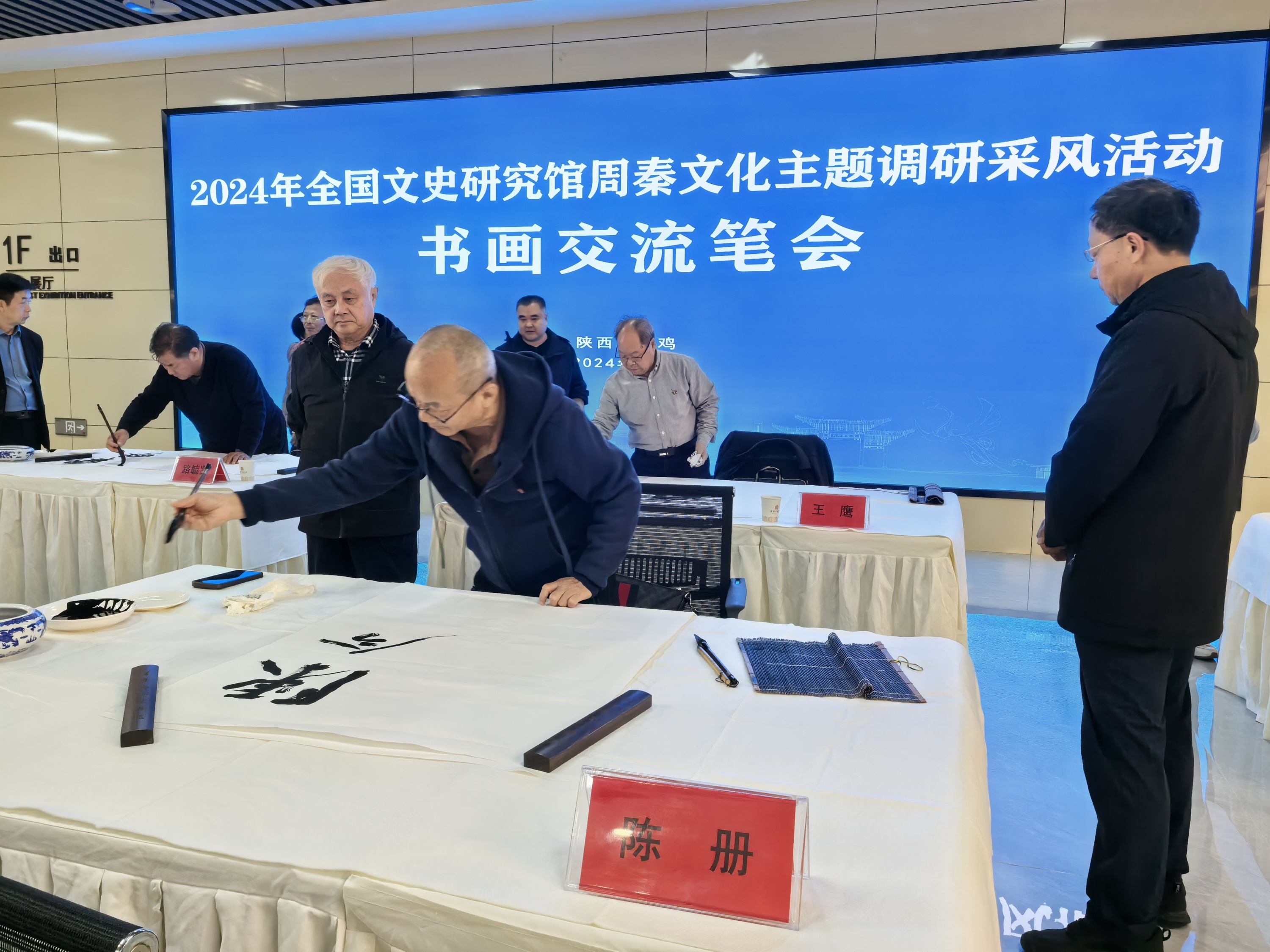 14日—15日,與會(huì)藝術(shù)家開展了周秦文化主題調(diào)研采風(fēng)活動(dòng),統(tǒng)一前往西秦刺繡產(chǎn)業(yè)園、青銅器博物院、長(zhǎng)樂塬抗戰(zhàn)工業(yè)遺址、先秦陵園博物館、鳳翔區(qū)泥塑村等調(diào)研采風(fēng)。書畫交流筆會(huì)上,重慶市政府文史研究館張?jiān)>V、陳冊(cè)館員現(xiàn)場(chǎng)創(chuàng)作多幅書法作品,與其它省市文史館館員進(jìn)行現(xiàn)場(chǎng)交流,得到在場(chǎng)其它省市文史館館員的一致好評(píng)。