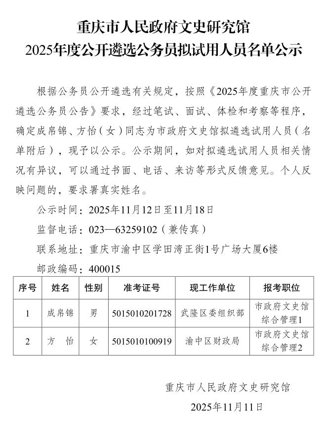 重慶市人民政府文史研究館2025年度公開(kāi)遴選公務(wù)員擬試用人員名單公示