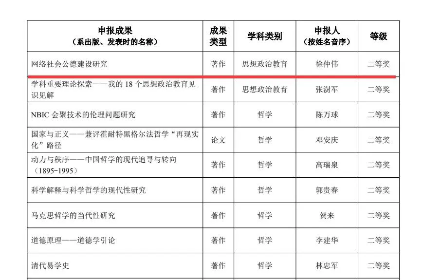 近日,教育部公布了《第九屆高等學(xué)校科學(xué)研究優(yōu)秀成果獎(人文社會科學(xué))》獲獎名單,該獎項(xiàng)為高校哲學(xué)社會科學(xué)領(lǐng)域的最高獎項(xiàng)。市政府文史館館員、重慶郵電大學(xué)教授徐仲偉申報(bào)的成果《網(wǎng)絡(luò)社會公德建設(shè)研究》榮獲著作論文獎二等獎。